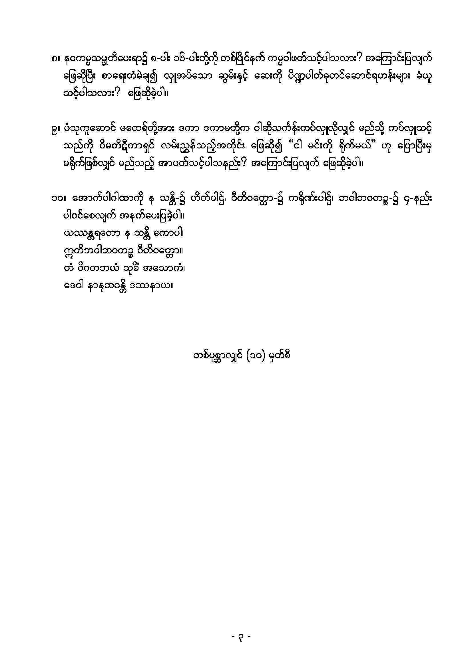 ၂၀၂၀ ခုနှစ် အဘိဝိနယာစရိယစာတော်ပြန်ပွဲ ဒုတိယအဆင့်မေးခွန်း