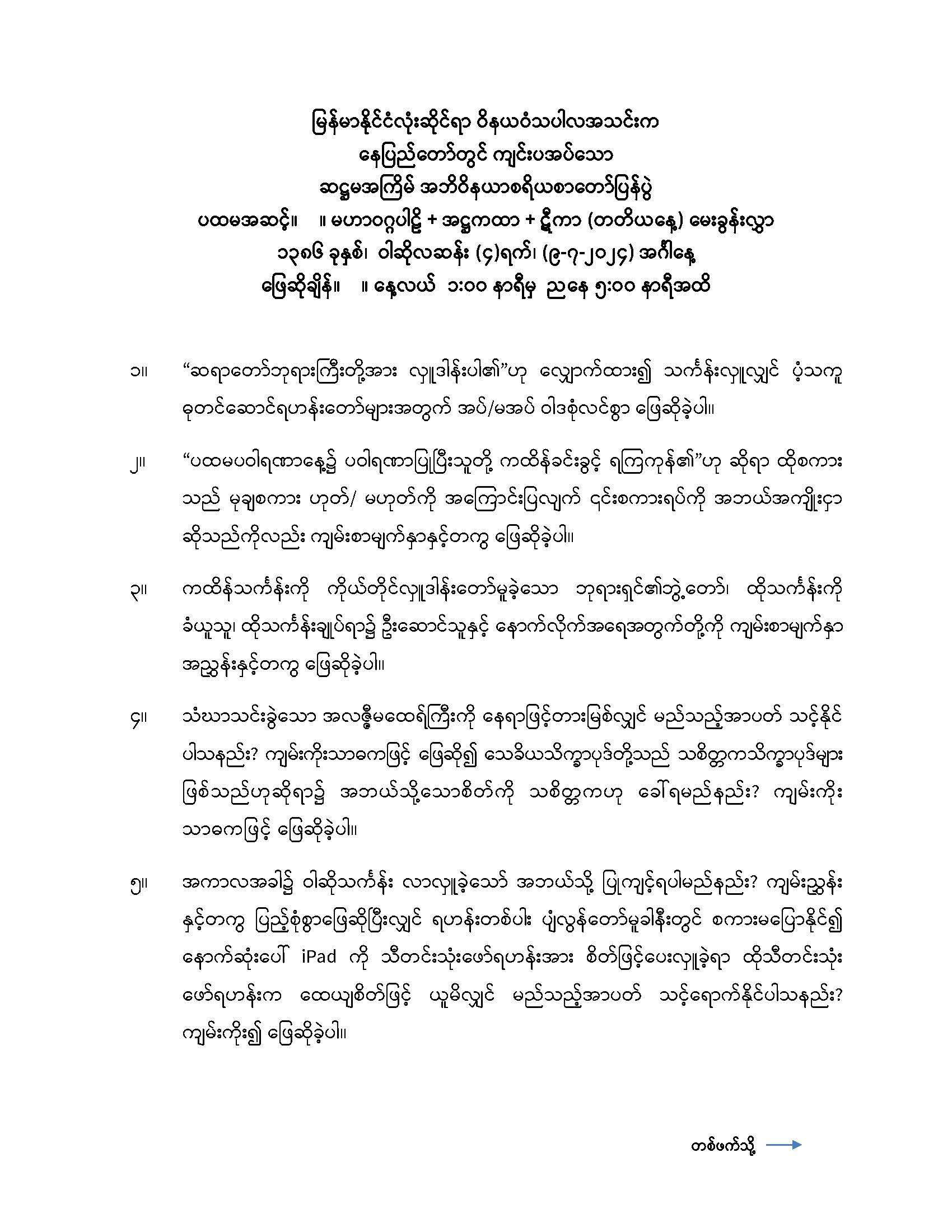 ၂၀၂၄ ခုနှစ် အဘိဝိနယာစရိယစာတော်ပြန်ပွဲ ပထမအဆင့်မေးခွန်း