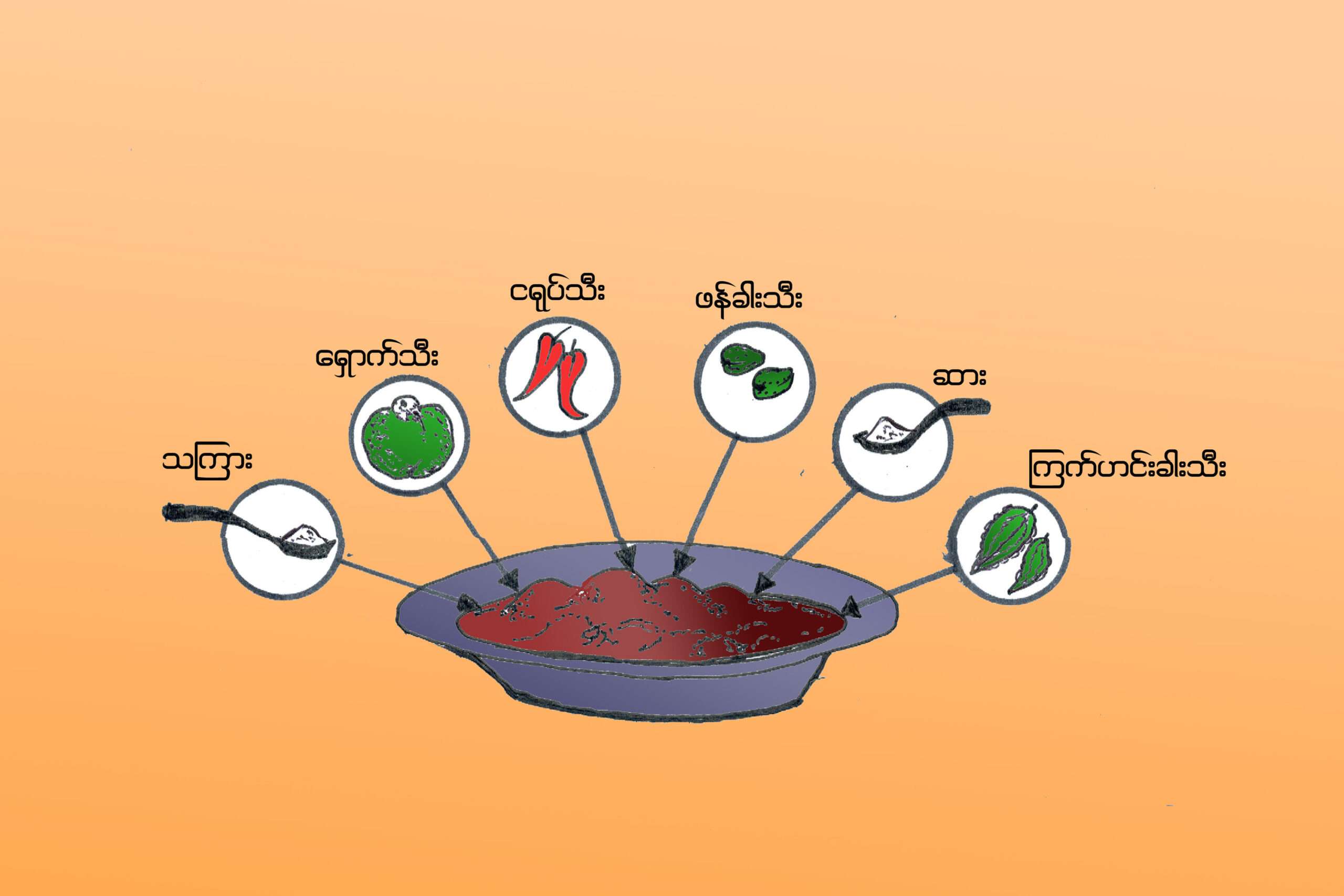 ‘ရသာခြောက်ပါး၊ ပေါင်း၍ထားသို့’ဟု ဖွင့်ဆိုသည်နှင့်အညီ ချို၊ ချဉ်၊ စပ်၊ ဖန်၊ ခါး၊ ငန် အရသာ ၆-ပါးတို့သည် အတူတကွ ရောထားသော်လည်း အသီးသီးသတ္တိပြကာ မရော နှောဘဲ ကျေးဇူးပြုသကဲ့သို့ မျက်စိ၊ နား၊ နှာ၊ လျှာ၊ ကိုယ်၊ ဟဒယဝတ္ထု၊ ပဋိသန္ဓေစိတ်၊ စေတသိက် စသော ရုပ်နာမ်တရားတို့သည် အတူဖြစ်နေသော်လည်း တစ်ပါးနှင့်တစ်ပါး မလိုက်လျော မယှဉ်တွဲဘဲ ကျေးဇူးပြုကြသည်။