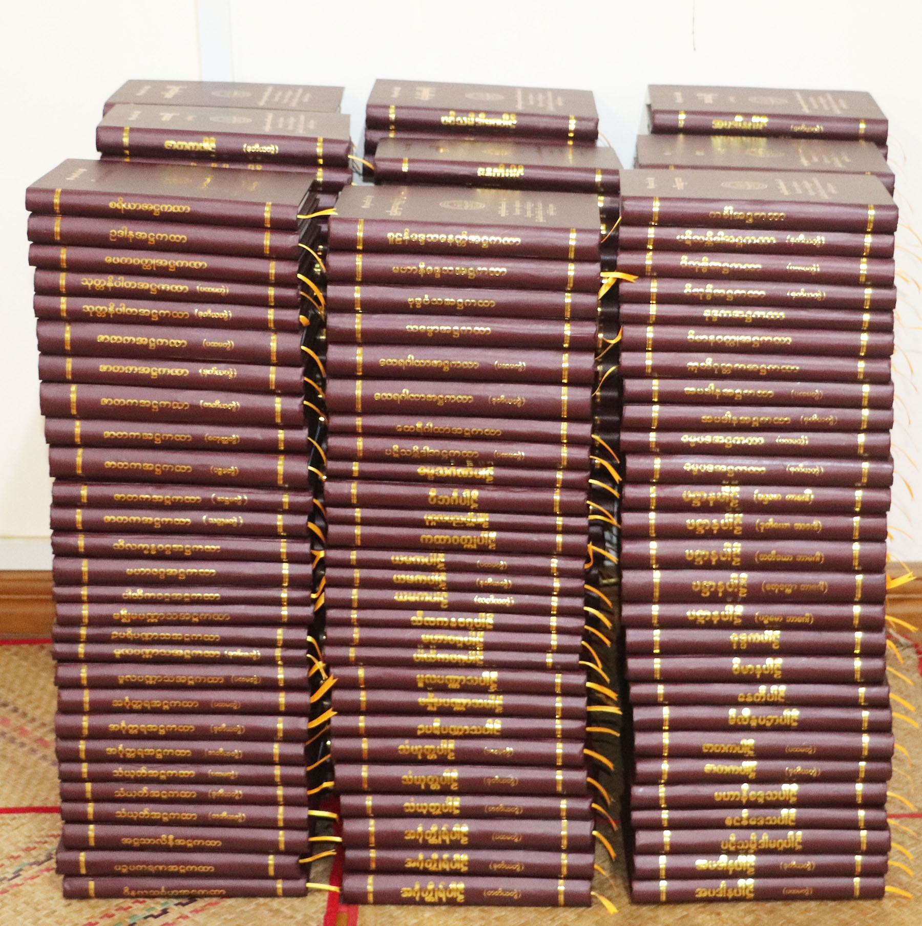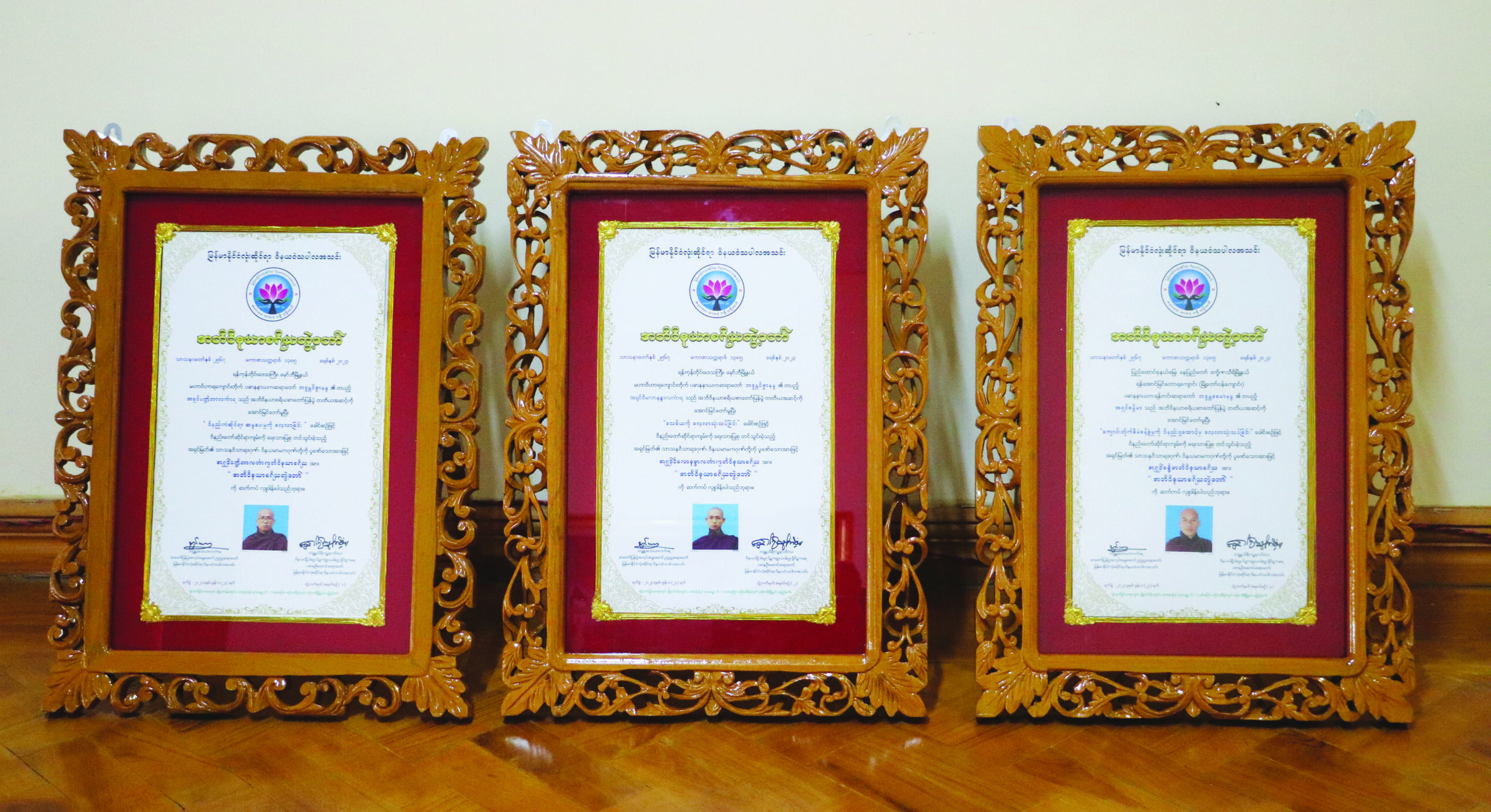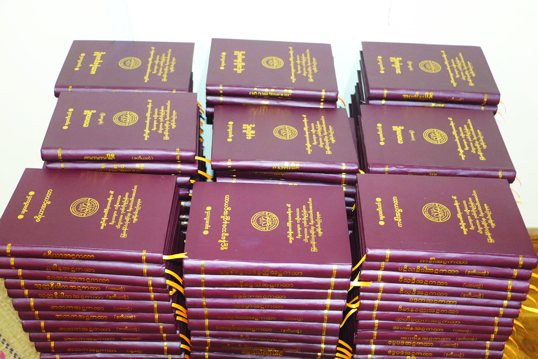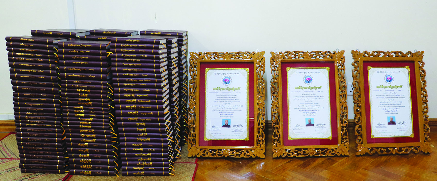 “အဘိဝိနယာစရိယ” ဘွဲ့တော်ဆက်ကပ်လှူဒါန်းရန် ကျမ်းစာအုပ်များနှင့် ဘွဲ့လက်မှတ်တော်များ ပြင်ဆင်ထားပုံ။
