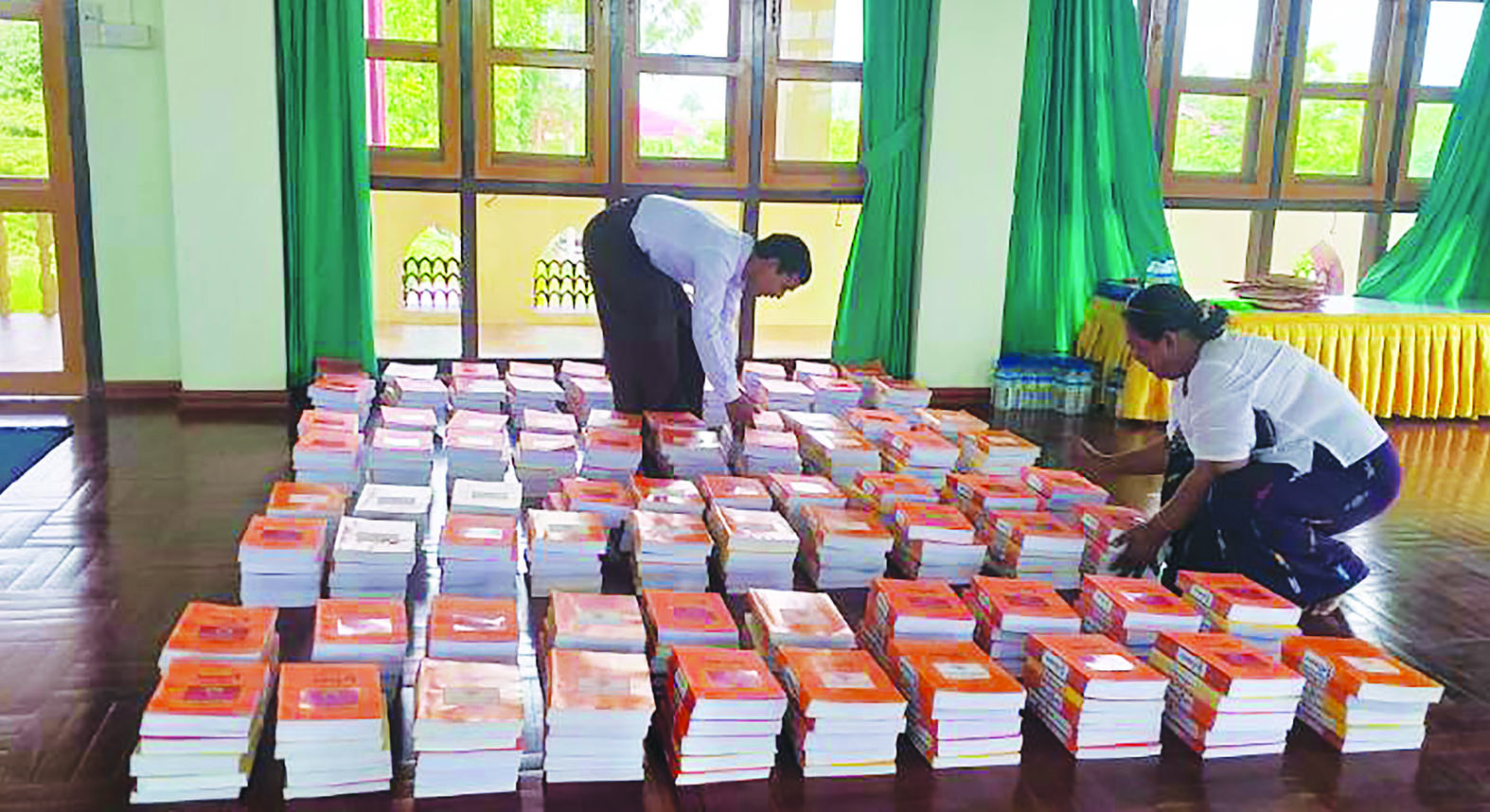 ကျမ်းစာအုပ်ဖွင့်စနစ် (Open Book Examination System) ဖြင့် ဖြေဆိုနိုင်ရေးအတွက် သက်ဆိုင်ရာ ကျမ်းစာအုပ်များကို ကြိုတင်ပြင်ဆင်ထားပုံ။