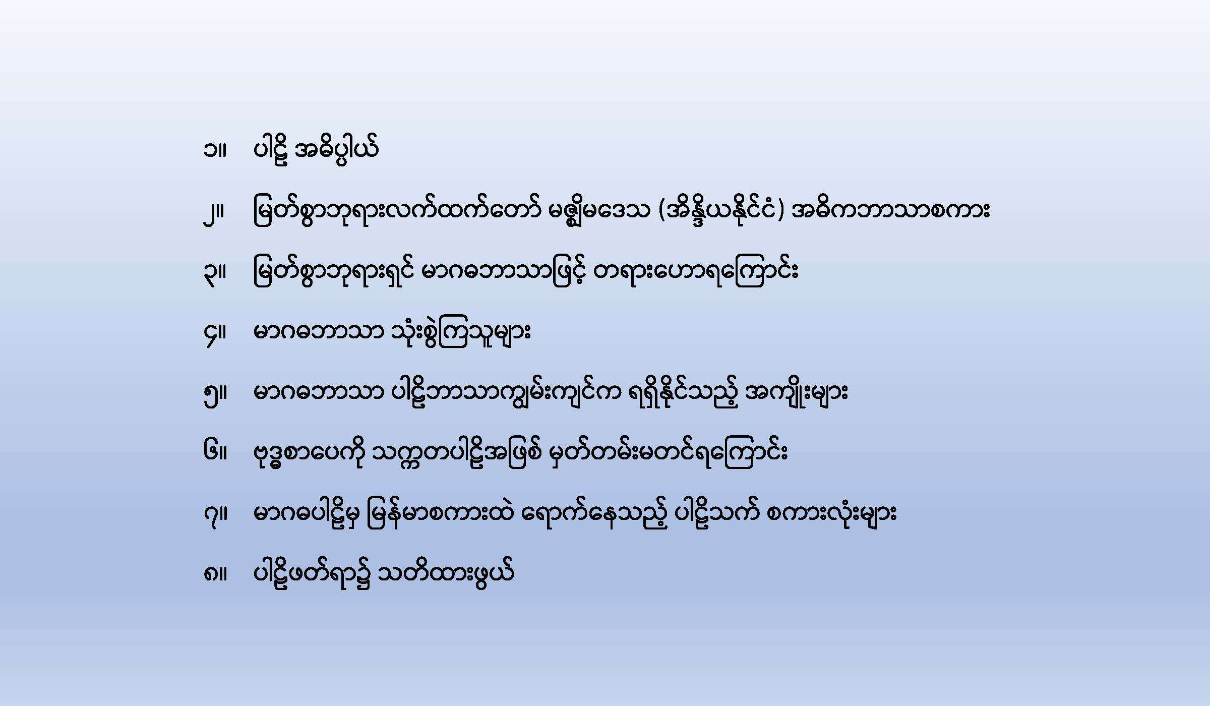 အောက်ပါ link မှ PDF File ကို download ရယူနိုင်ပါသည်။ ပါဠိအခြေခံသင်ခန်းစာ (ပထမနေ့) (488 downloads ) Post Views: 306