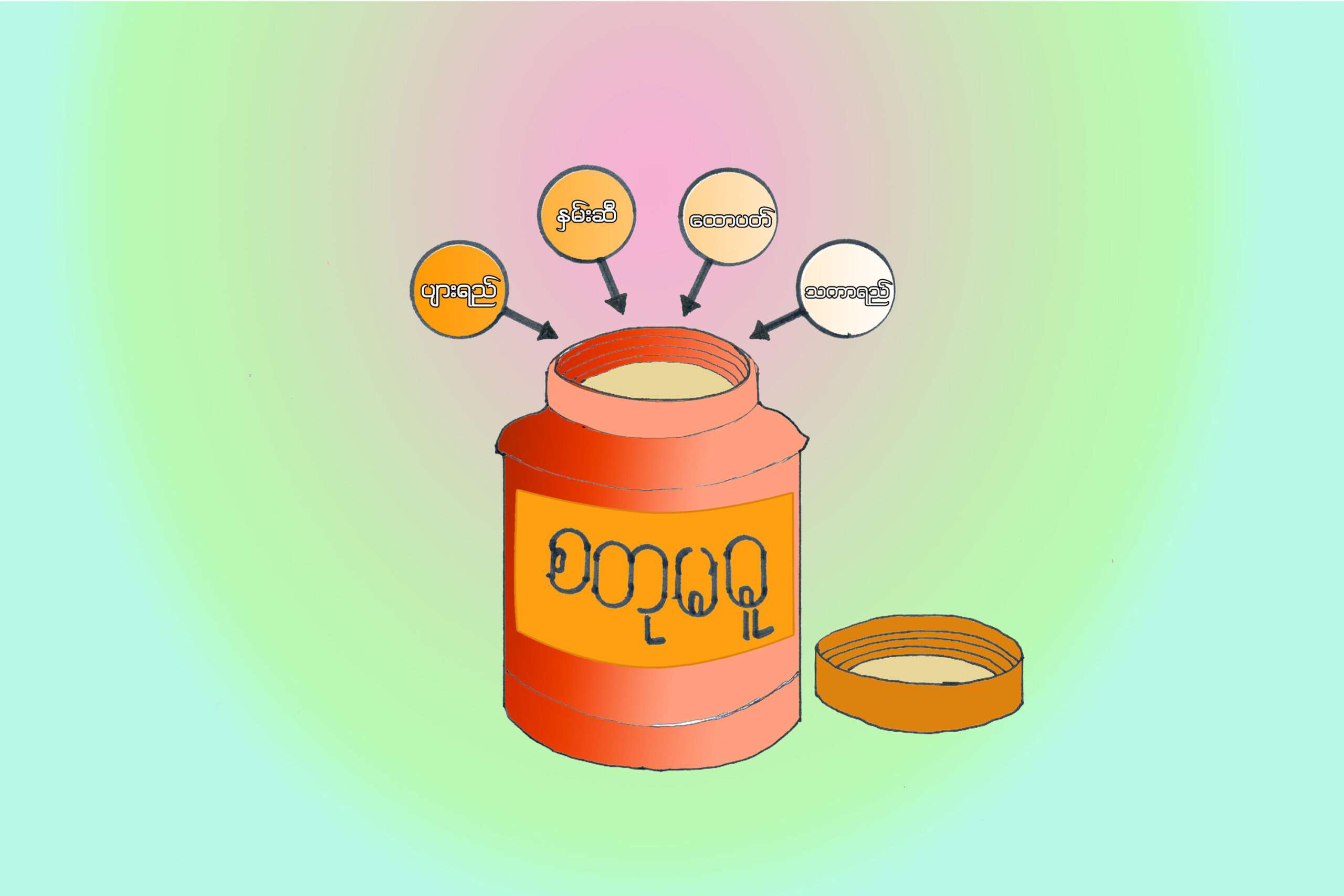 ‘စတုမဓူ၊ ရောစပ်မူနှင့် ၊ နည်းတူလှစွာ’ဟု လာရှိသည်နှင့် အညီ ထောပတ်၊ ပျားရည်၊ သကာ၊ နှမ်းဆီတို့ကို သမသွားအောင် မွှေသောအခါ တစ်ခုချင်း၏ အရသာ မထွက်တော့ဘဲ အရသာတစ်မျိုးတည်း ထွက်သကဲ့သို့ နာမ်ခန္ဓာ (၄)ပါး တရားတို့သည် အာရုံကို ယူသောအခါ တစ်ပါးချင်း၏သဘော မထင်ရှားဘဲ တစ်ပါးနှင့်တစ်ပါး အတူတကွ နှီးနှောယှဉ်တွဲ ဖြစ် ချုပ်မှီ အာရုံကိုယူပြီး ကျေးဇူးပြုကြသည်။
