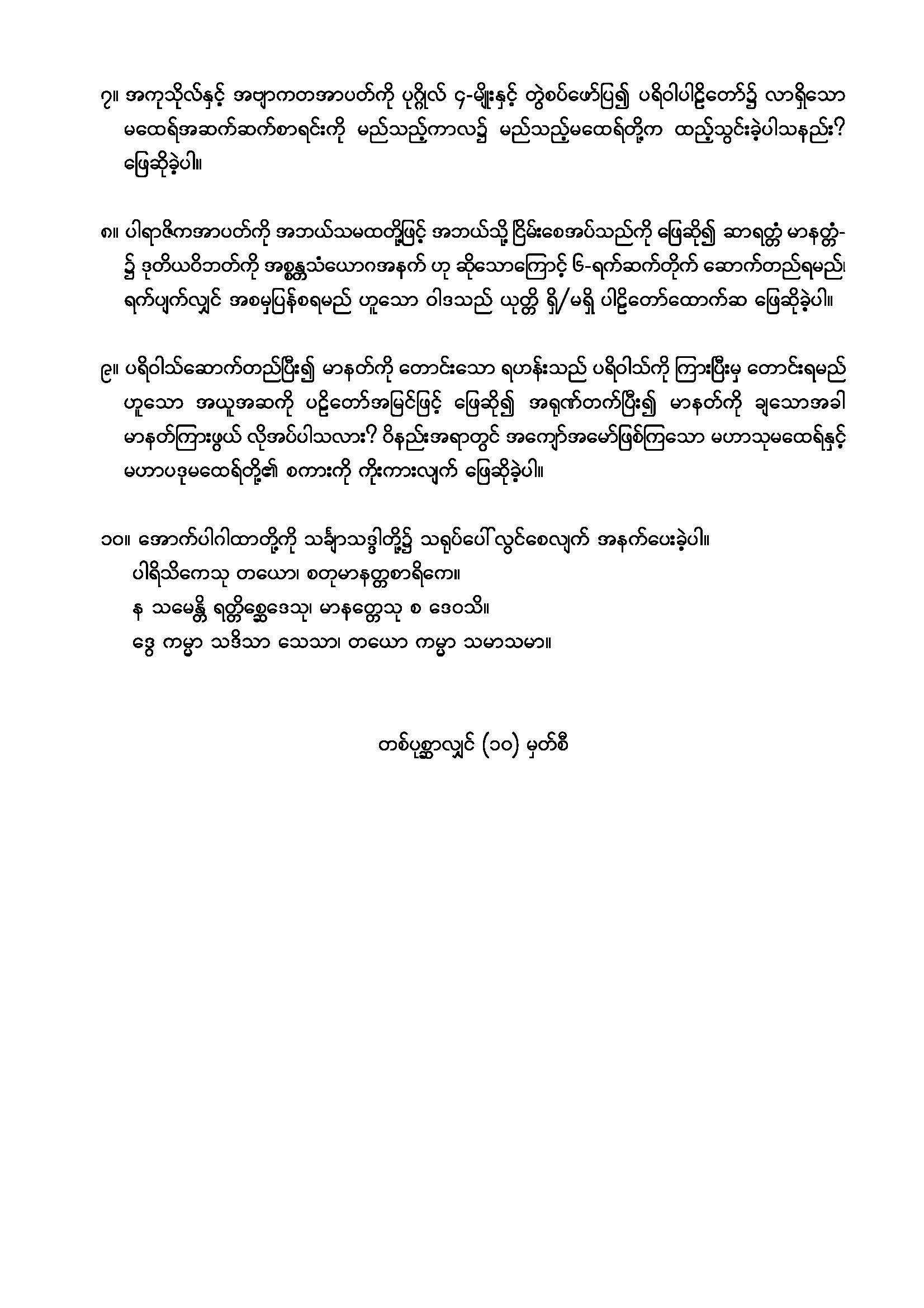 ၂၀၂၀ ခုနှစ် အဘိဝိနယာစရိယစာတော်ပြန်ပွဲ ဒုတိယအဆင့်မေးခွန်း