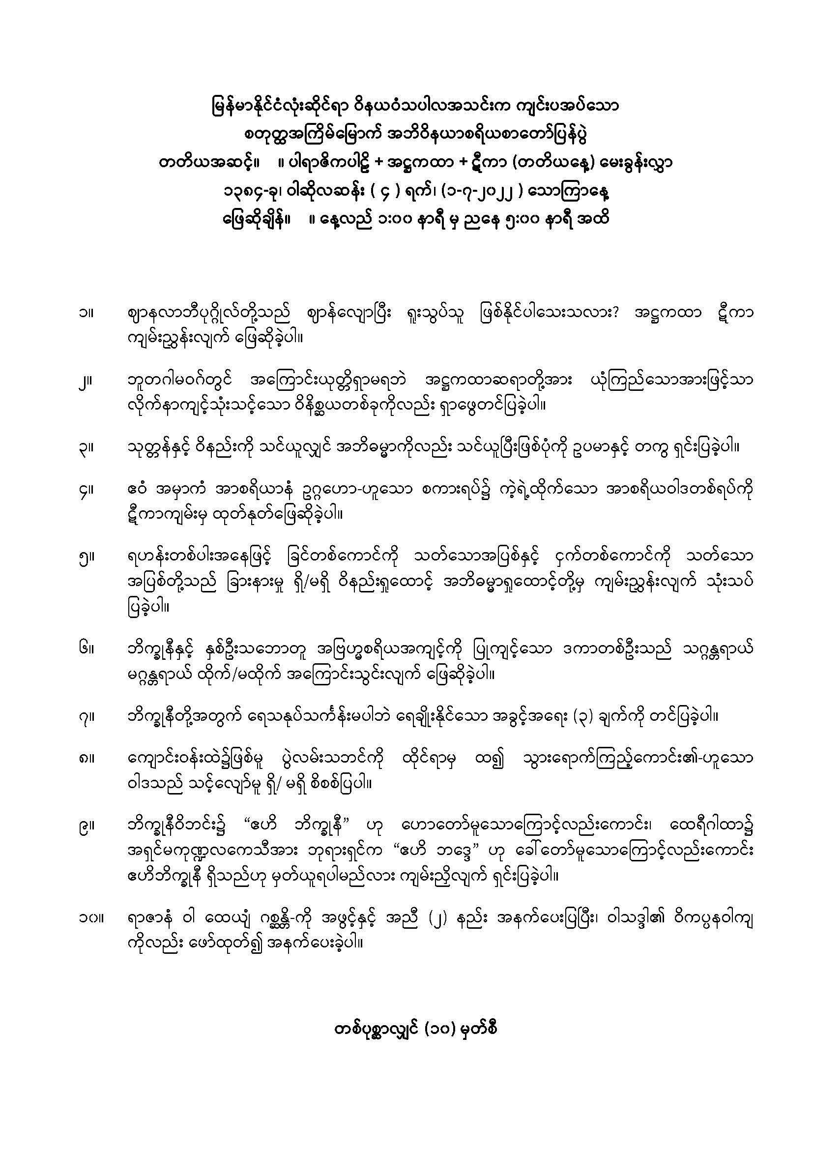 ၂၀၂၂ ခုနှစ် အဘိဝိနယာစရိယစာတော်ပြန်ပွဲ တတိယအဆင့်မေးခွန်း