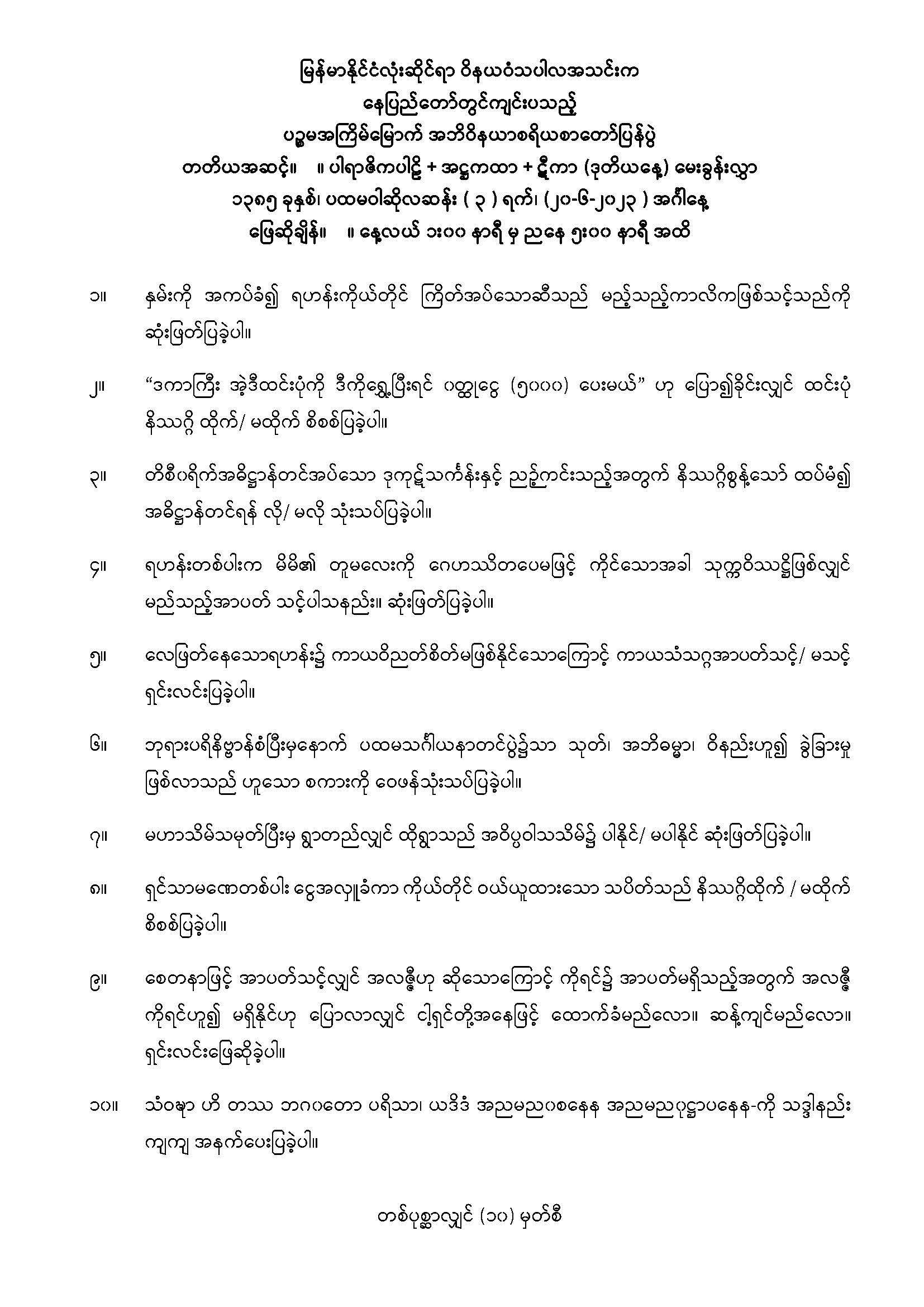 ← ၂၀၂၂ ခုနှစ် အဘိဝိနယာစရိယစာတော်ပြန်ပွဲ ပထမအဆင့်မေးခွန်း ၂၀၂၃ ခုနှစ် အဘိဝိနယာစရိယစာတော်ပြန်ပွဲ ဒုတိယအဆင့်မေးခွန်း →